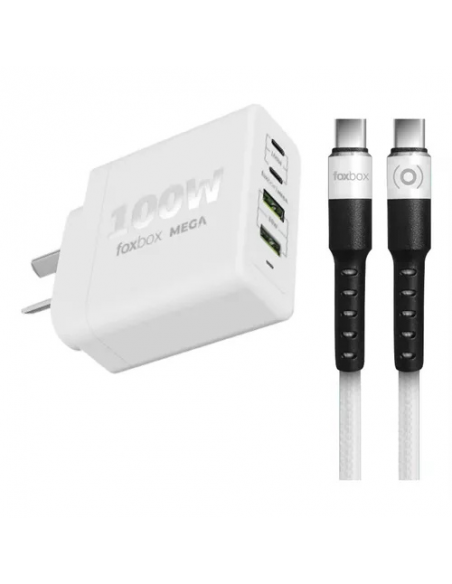 Cargador Foxbox Mega 100w + Cable Type Cpd20w Qc 3.0 Gan Pps - 4 Puertos De Carga + Cable Round Type C (5928) - Blanco - Neg